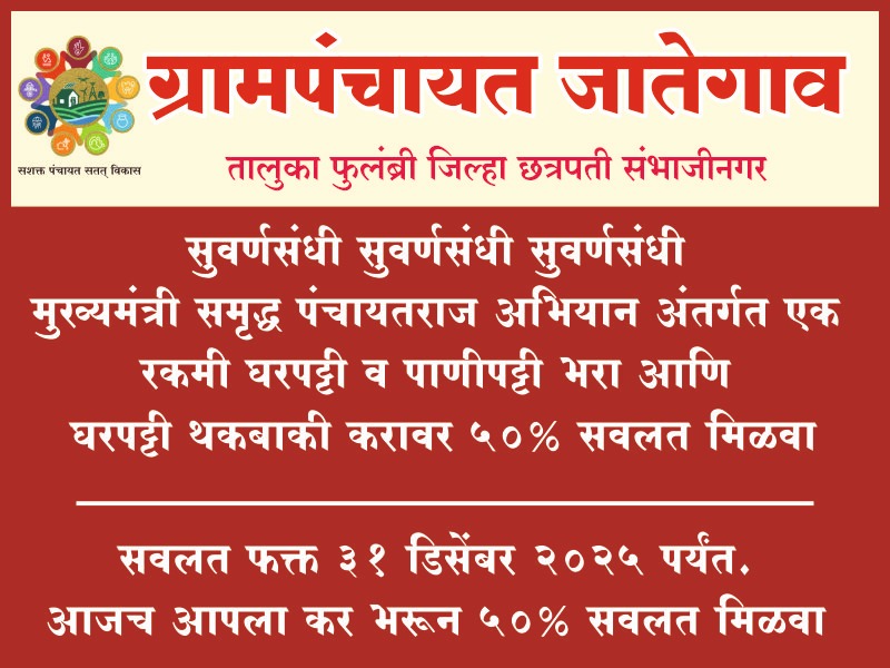 विकसित भारत-ग्राम अधिनियम 2025 बाबत माहिती देण्यासाठी दि.26/12/2025 रोजी सकाळी 10:00 वाजता ग्रामसभेचे आयोजन करण्यात आलेले आहे ● मुख्यमंत्री समृद्ध पंचायतराज अभियान: एक रकमी घरपट्टी भरा, ५०% सवलत मिळवा